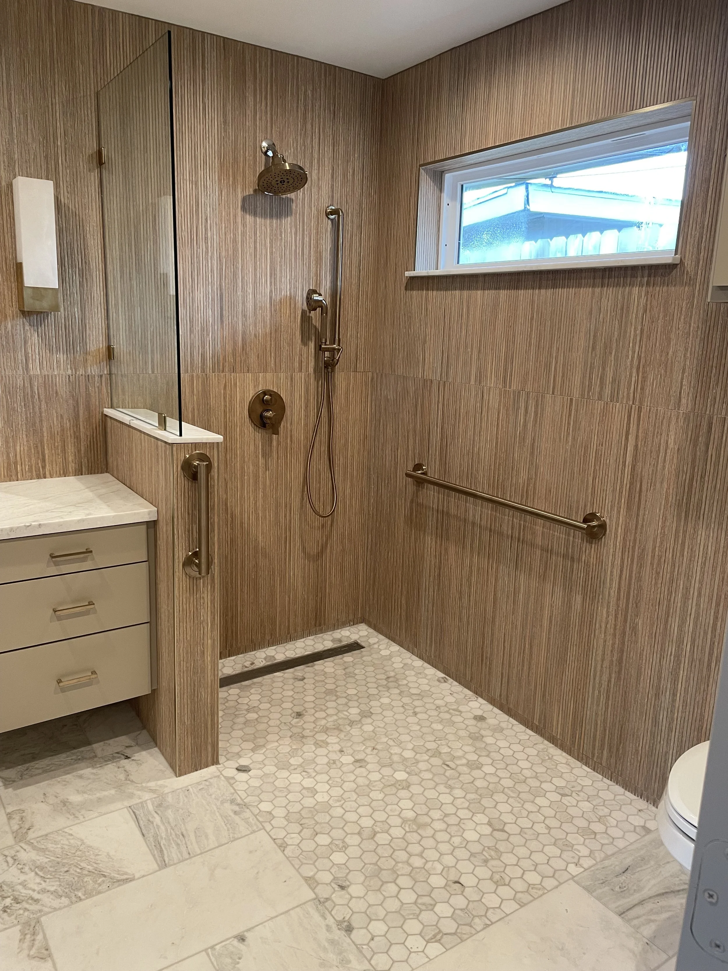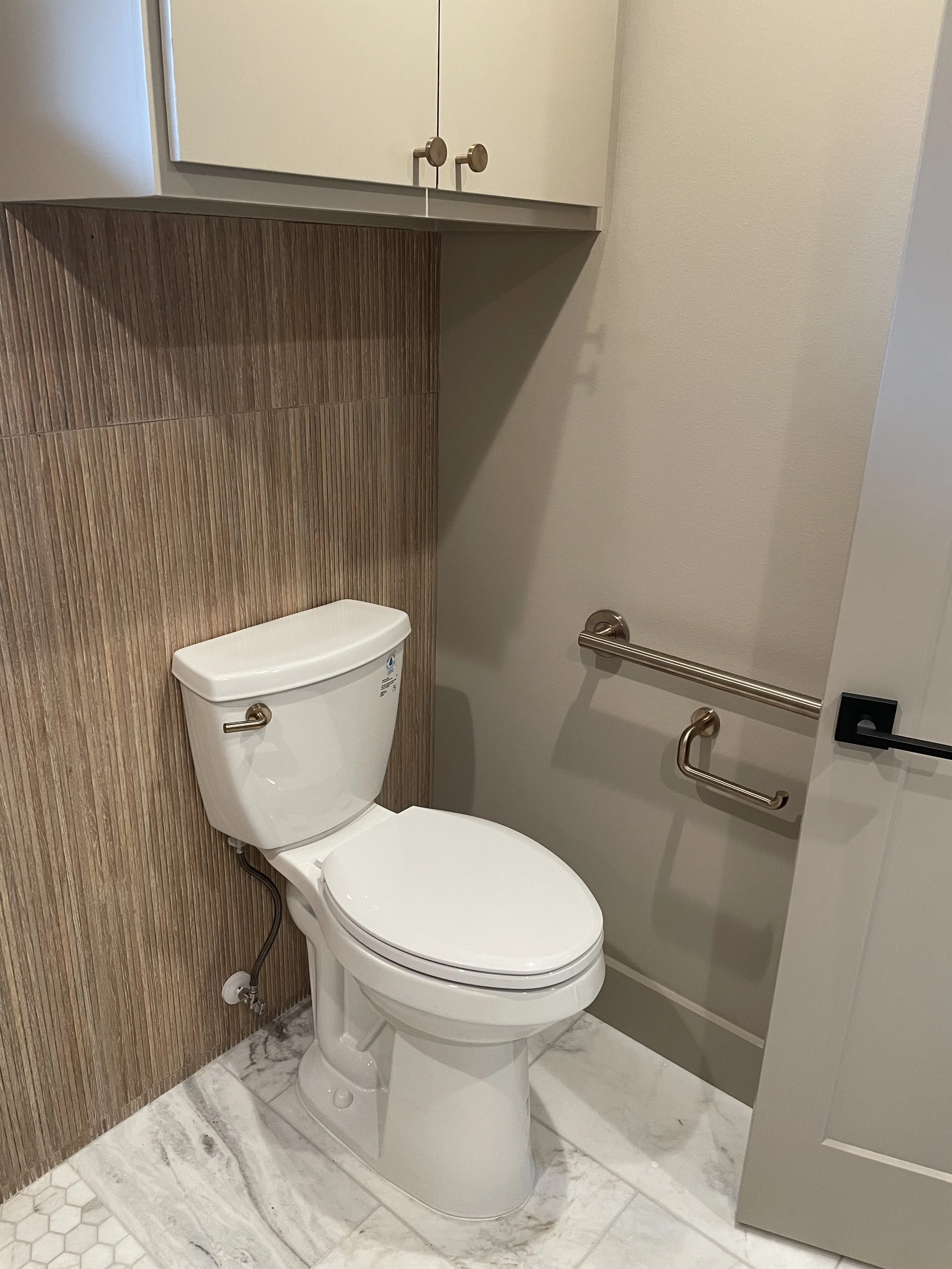 It was evident to switch existing plumbing fixtures to allow space for wheelchair, grab bars, and personnel assistance.