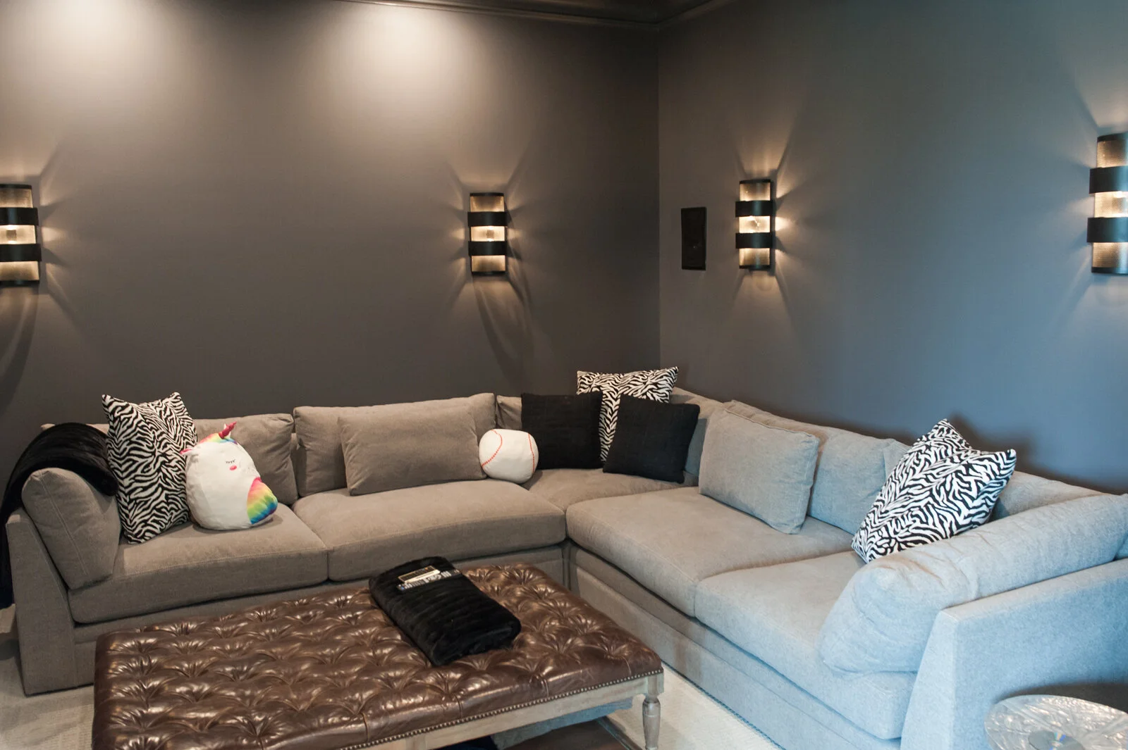 A home theater room with a large white projection screen on a dark wall, two small speakers flanking the screen, a modern wall sconce with a geometric design providing warm lighting, a small round side table, a gray sofa with black and white patterne View fullsize