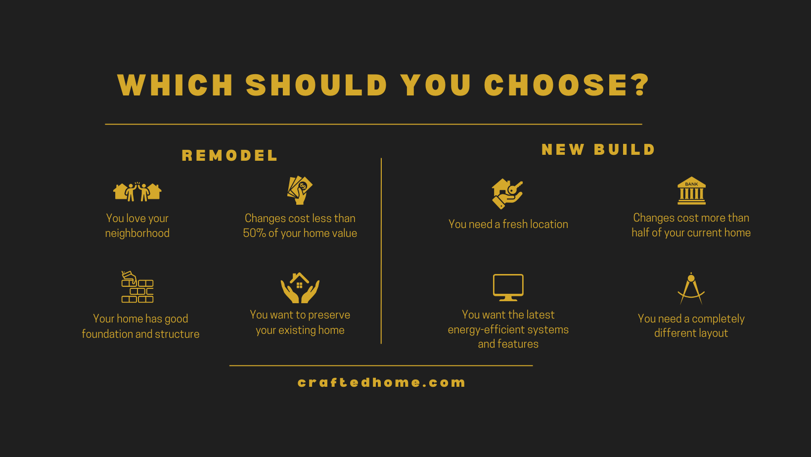 On the other hand, building new makes more sense when your desired changes would affect more than half of your existing home, when you need a completely different layout that can't be achieved through remodeling, or when you're ready for a completely fresh start in a new location.