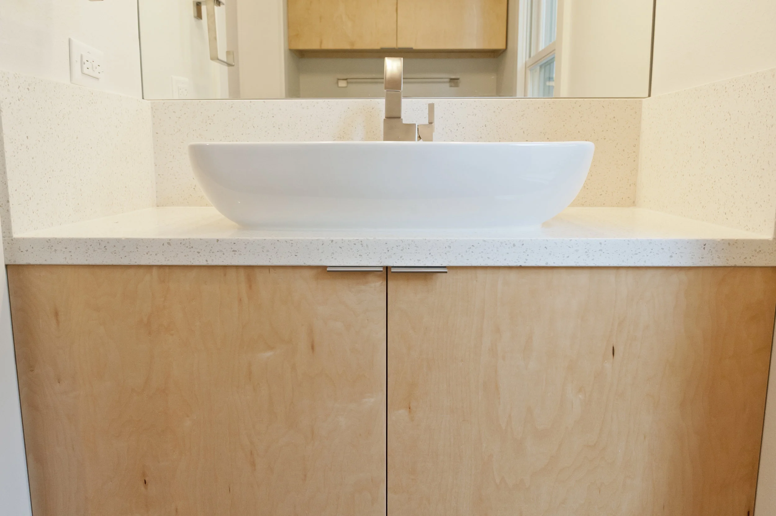 A bathroom vanity with a white oval vessel sink and a chrome faucet. The vanity has light wood cabinet doors and a speckled beige countertop. There is a large mirror above the sink, reflecting a window and a part of the room.