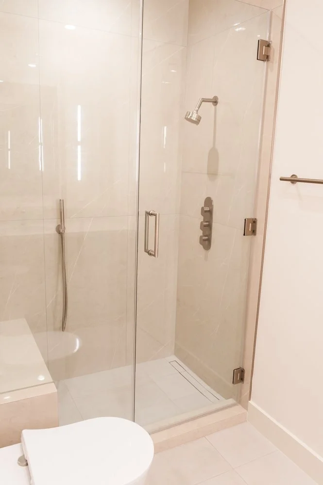 A minimalistic bathroom with a glass shower enclosure, beige tiles, a white toilet, and a towel bar on the wall.